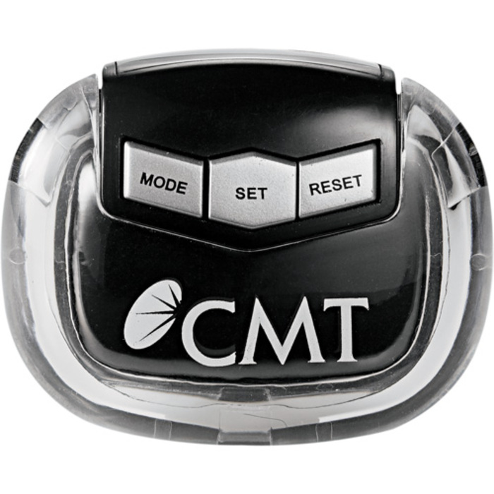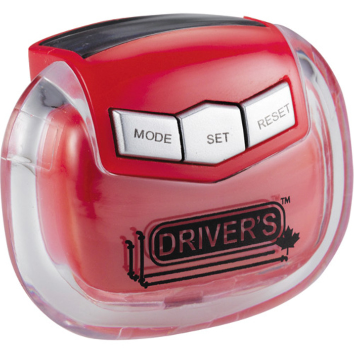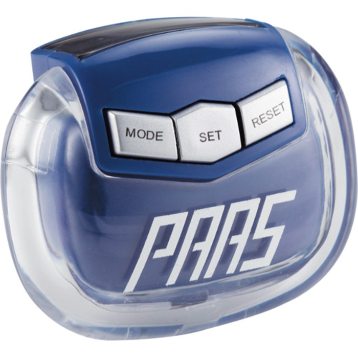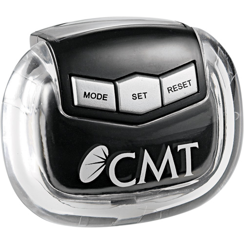 Pedometer measures calories burned, steps taken (99,999), and distance traveled (miles). Belt clip attached. Includes instructions and button cell battery.