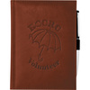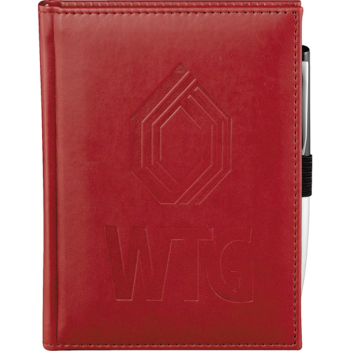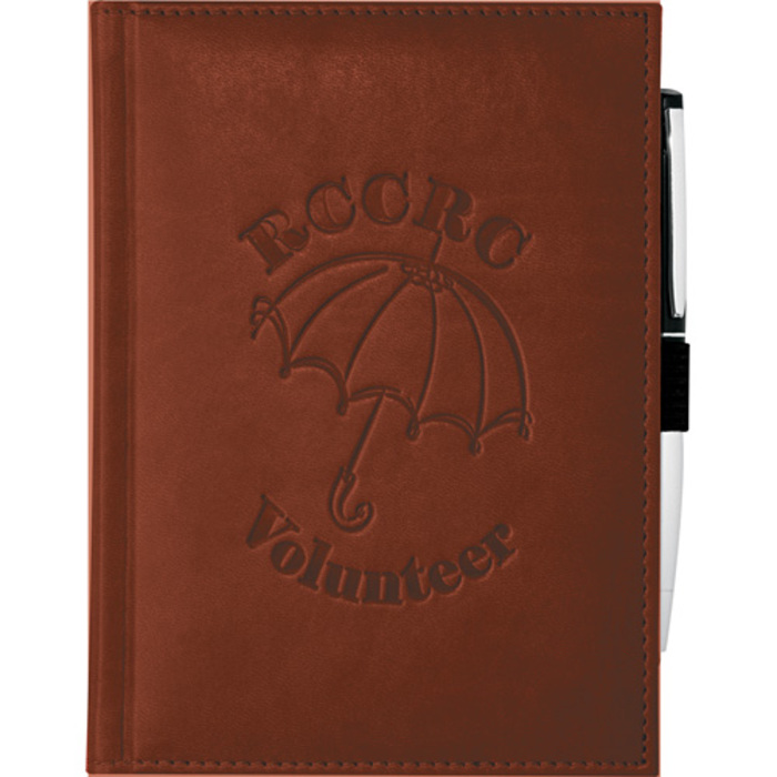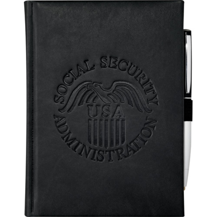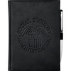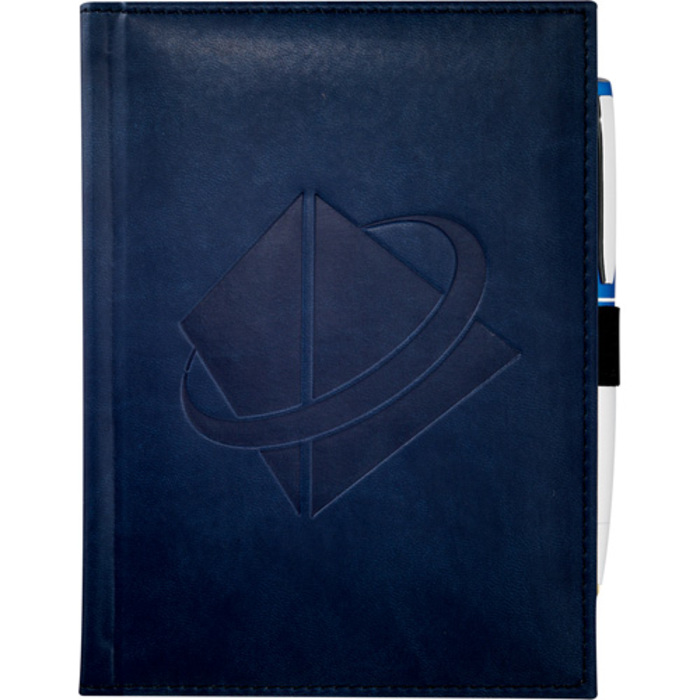 Elastic pen loop. Blue and silver ribbon page markers. Includes 125 sheets of lined paper.